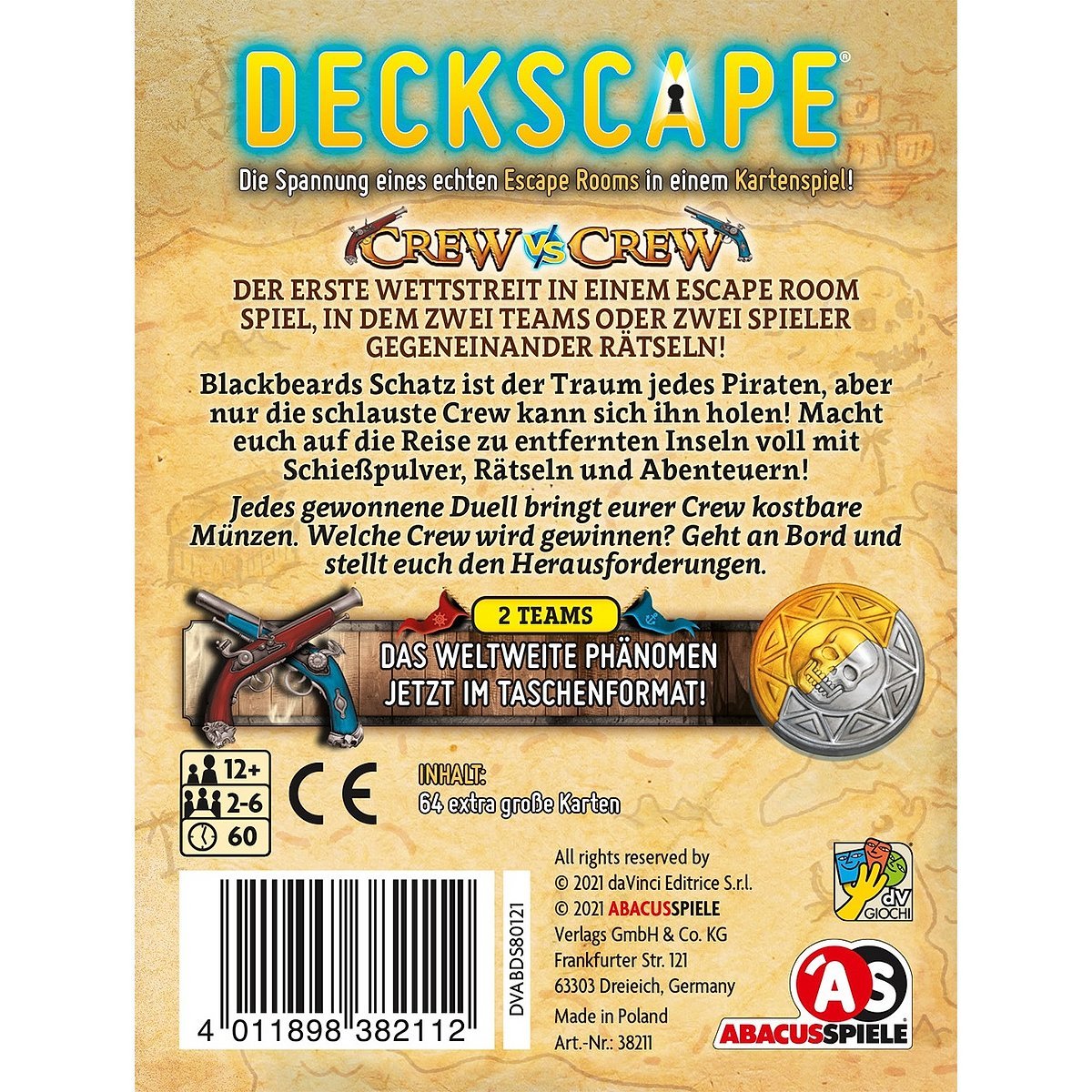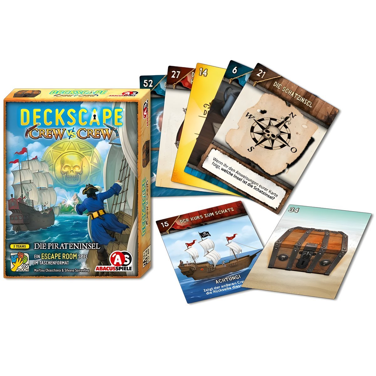Ahoi, ihr Landratten! In „Deckscape – Crew vs Crew – Die Pirateninsel“ von Abacusspiele kämpfen zwei Crews um Blackbeards legendären Schatz. Macht euch bereit für eine abenteuerliche Reise zu entlegenen Inseln, voller kniffliger Rätsel und spannender Duelle! Jedes gewonnene Duell spült wertvolle Münzen in eure Kasse. Welche Crew wird als Erste Blackbeards Schatz in den Händen halten? Geht an Bord und stellt euch den Herausforderungen! Ein packendes Wettrennen für 2-6 Spieler ab 12 Jahren. Enthält 64 extra große Karten für maximalen Rätselspaß!