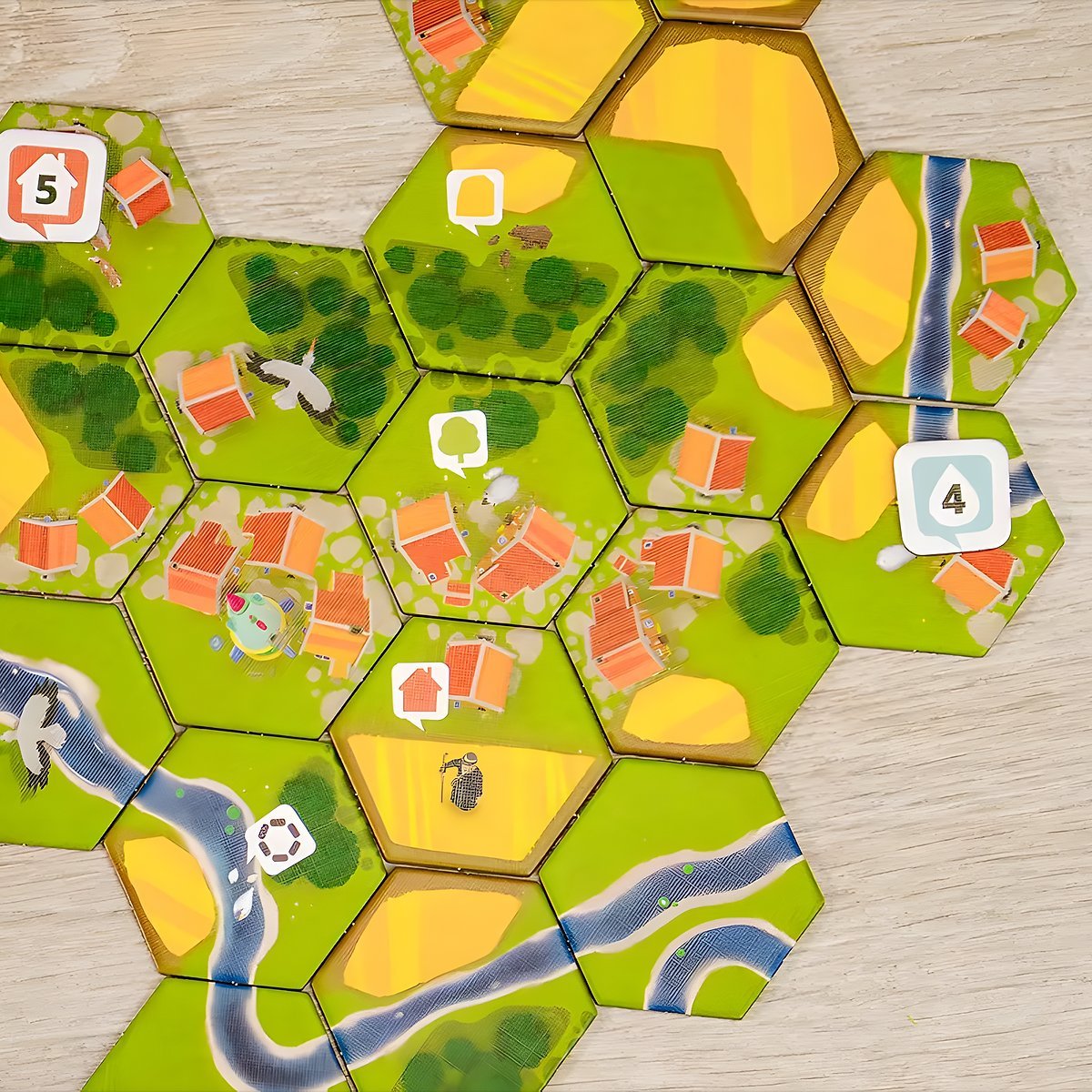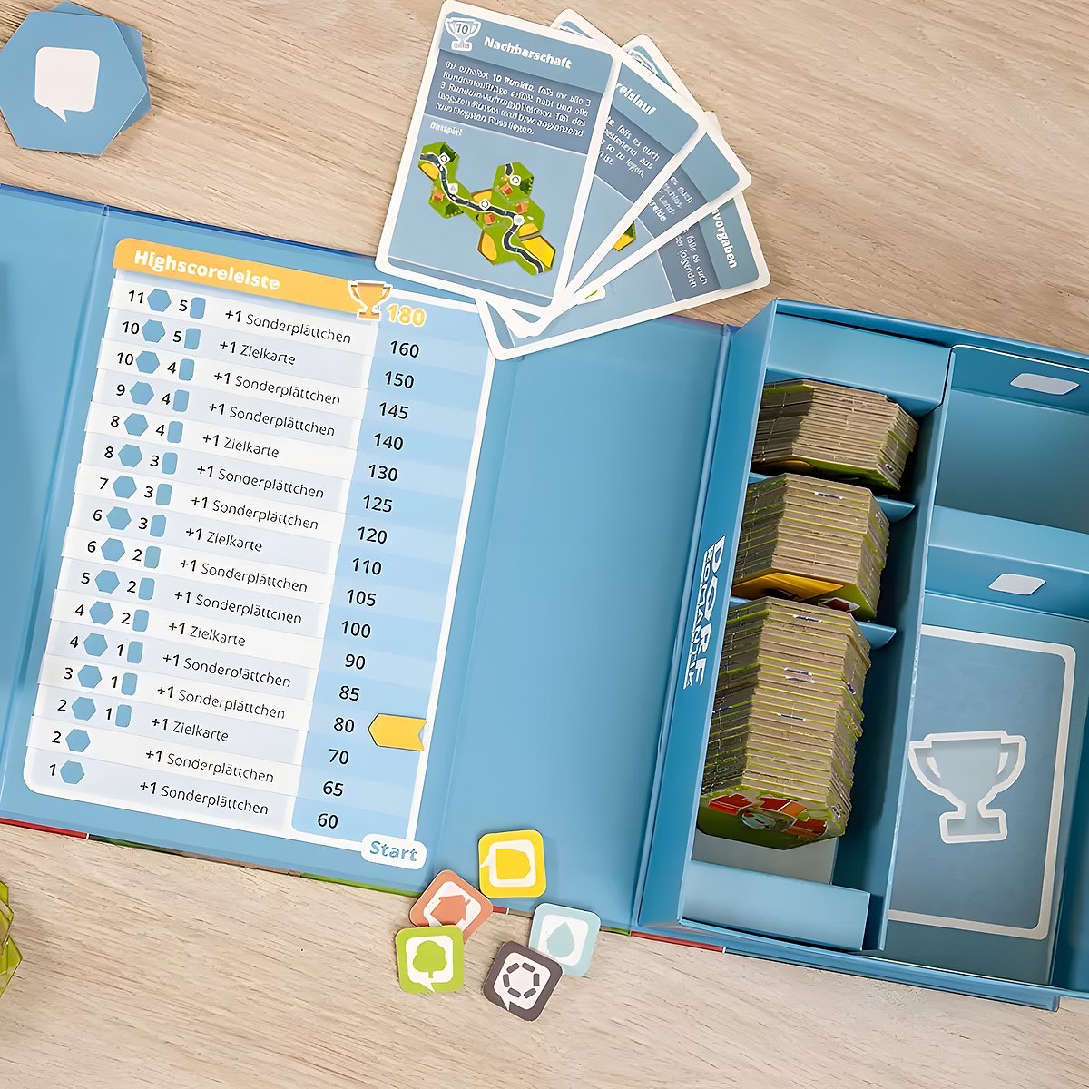 Diese kompakte Version ist ideal für unterwegs oder für eine schnelle Partie zwischendurch und bietet den bekannten Charme des Originals in einem zugänglichen Format. Neue Landschaftsmerkmale wie der Heißluftballon und die Fähre bringen frischen Wind in deine Dorfgemeinde und eröffnen zusätzliche strategische Möglichkeiten. Ob allein oder mit bis zu sechs Freunden, „Dorfromantik Leichtes Gepäck“ verspricht entspannte Unterhaltung und die Freude am gemeinsamen Gestalten. Es kann auch mit dem Grundspiel kombiniert werden, um neue Kampagnen zu erleben und die Spieltiefe zu erweitern.