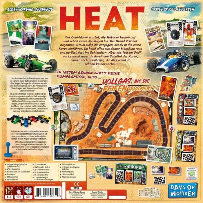 Heat bringt das thrillinge Gefühl der Formel-1-Rennen der 1960er Jahre direkt auf deinen Spieltisch! In diesem hochgelobten Brettspiel von Days of Wonder übernimmst du das Steuer eines Rennwagens und kämpfst dich mit cleverem Handmanagement, strategischem Deckbuilding und einer Prise Push-Your-Luck durch spannende Kurse. Spüre die Hitze des Asphalts und die Adrenalin-gefüllte Spannung, während du versuchst, deine Gegner zu überlisten und als Erster die Ziellinie zu überqueren.