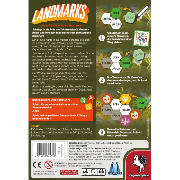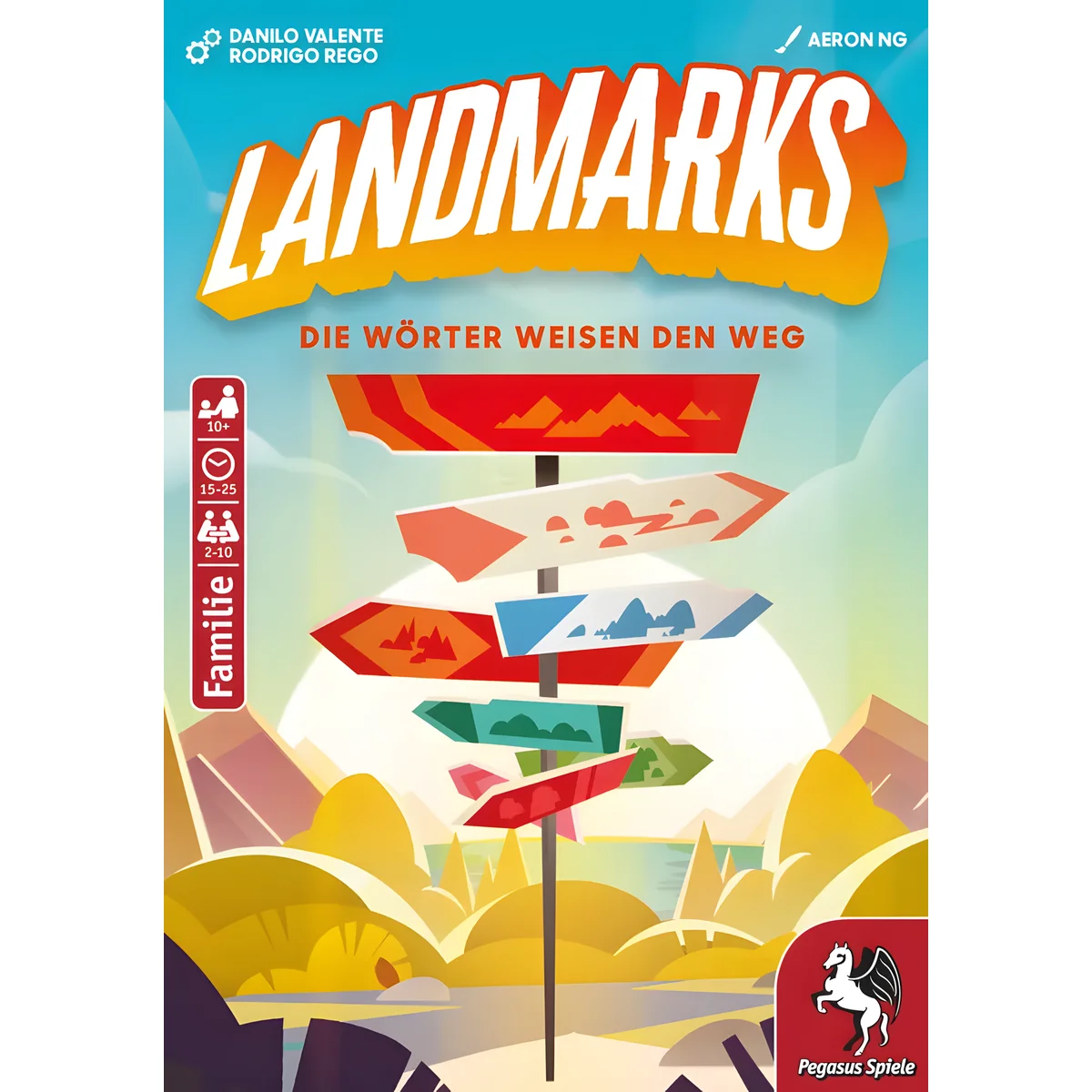 Landmarks ist ein kooperatives Wortassoziationsspiel für 2 bis 10 Spielende ab 10 Jahren von Rodrigo Rego & Danilo Valente, erschienen bei Pegasus Spiele. Das Expeditionsteam rund um die mysteriöse Schatzinsel-Führerin Montana Bones wagt sich gemeinsam in den Dschungel – bewaffnet nicht mit Werkzeug, sondern mit Wörtern: Eine Person schreibt pro Runde einen verschlüsselten Hinweis auf ein Wortplättchen, das die Gruppe dann korrekt an die ausliegende Landkarte anlegen muss. Wer falsch tippt, riskiert Fallen, Flüche und kostbare Wasserreserven.