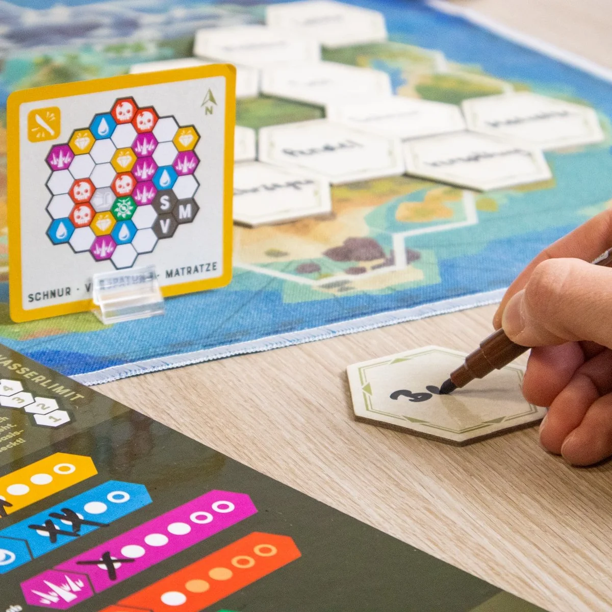 Das Besondere an Landmarks ist die Kombination aus Puzzle-Legespiel und Kreativ-Kommunikation: Nur wer die Gedankenwelt seiner Mitspieler wirklich kennt, findet den Weg zu den Juwelen – und zurück ins Basislager. Neben dem kooperativen Modus bietet das Spiel auch einen spannenden kompetitiven Teammodus, in dem zwei Gruppen gegeneinander antreten. Mit 150 Startkarten in drei Schwierigkeitsstufen, einer Landkarte aus Stoff und einem abwischbaren Stift ist Landmarks sofort spielbereit und immer wieder neu. Ideal für Spieleabende mit Familie oder Freundesgruppen, die gerne um die Ecke denken.