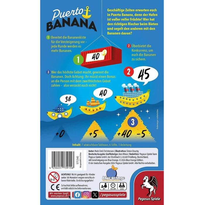Puerto Banana ist ein packendes, leichtgewichtiges Versteigerungsspiel, bei dem Sie mit geheimen Geboten um virtuelle Bananen kämpfen. Das Ziel ist simpel: Wer zuerst 200 Bananen besitzt, gewinnt die Partie. Jede Runde wird verdeckt geboten, wie viel Sie bereit sind, für die nächste Kiste voller exotischer Früchte auszugeben. Der Clou liegt in der Auszahlung: Der Höchstbietende sichert sich die Bananen, muss aber die Differenz seines Gebots zum zweithöchsten Gebot an den zweitplatzierten Spieler abgeben. Dieses Risiko-Management und die Fähigkeit, die Psychologie Ihrer Mitspieler richtig einzuschätzen, sind entscheidend, um Ihren Vorrat aufzubauen. Perfekt für schnelle Runden als Eröffner oder Absacker.