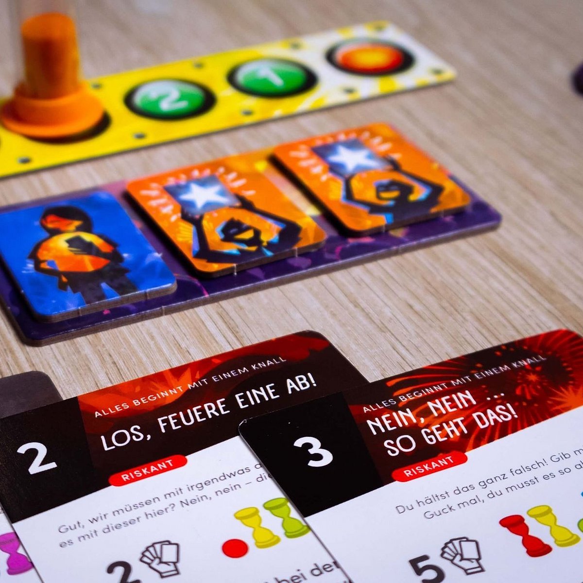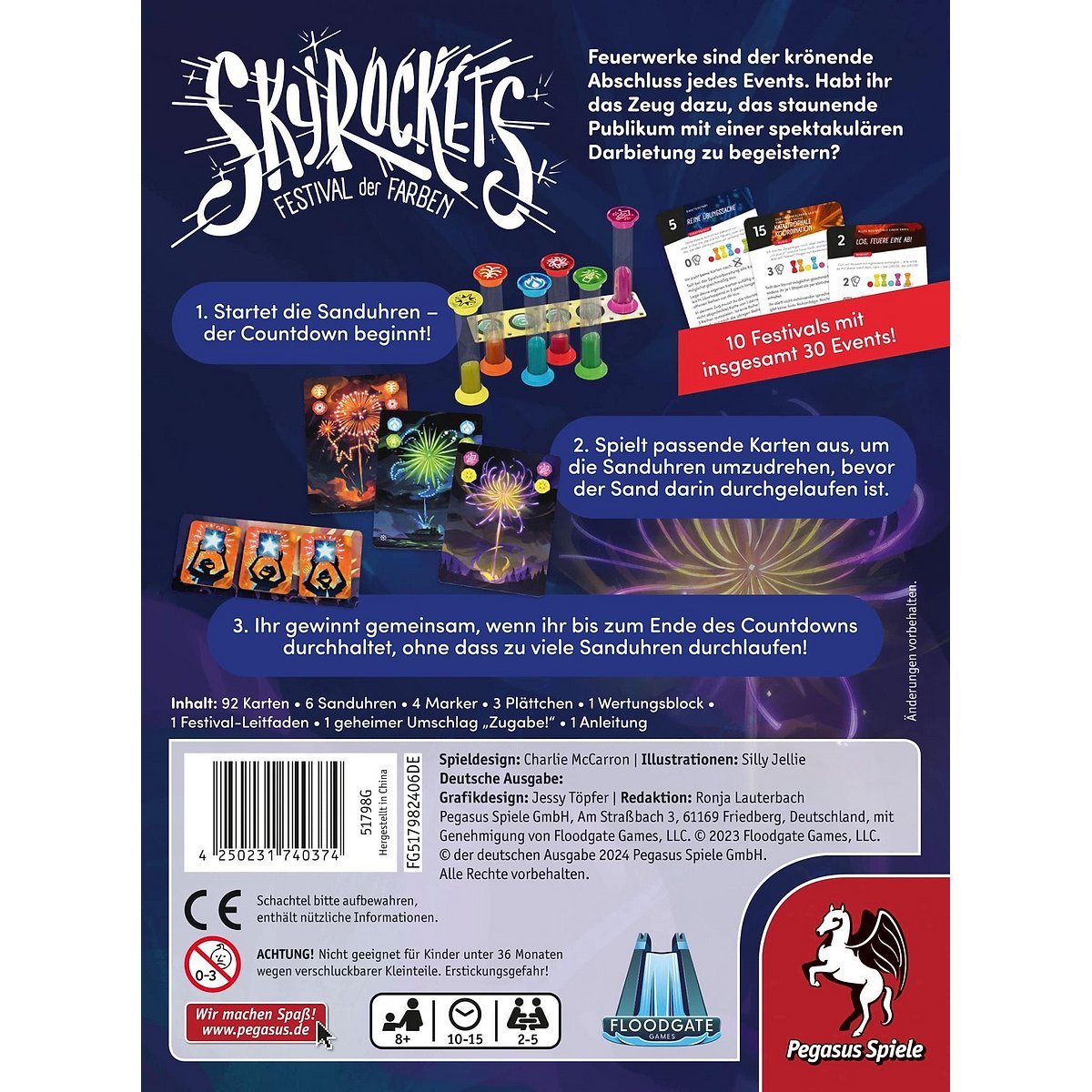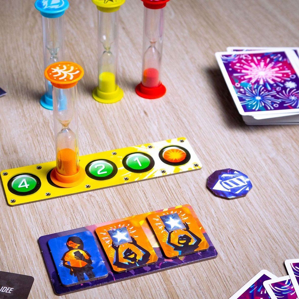 Skyrockets – Festival der Farben katapultiert Spielende in ein atemberaubendes kooperatives Feuerwerksspektakel! Hier müsst ihr perfekt timen, um gemeinsam die schönsten Raketen in den Nachthimmel zu schicken. Sechs farbige Sanduhren bestimmen die verbleibende Zeit für jede Rakete – von superschnell (30 Sekunden Rot) bis langgezogen (80 Sekunden Lila). Durch geschicktes Ausspielen von Feuerwerkskarten, die immer zwei Sanduhren zeigen, müsst ihr die Uhren im exakt richtigen Moment umdrehen. Schnelles Teamwork ist entscheidend, denn lässt ihr eine Sanduhr durchlaufen, wird die Rakete zum Blindgänger und das Publikum ist enttäuscht! Mit 30 unterschiedlichen Events sorgen die skyrockets für immer neue Herausforderungen und garantierten Spielspaß.