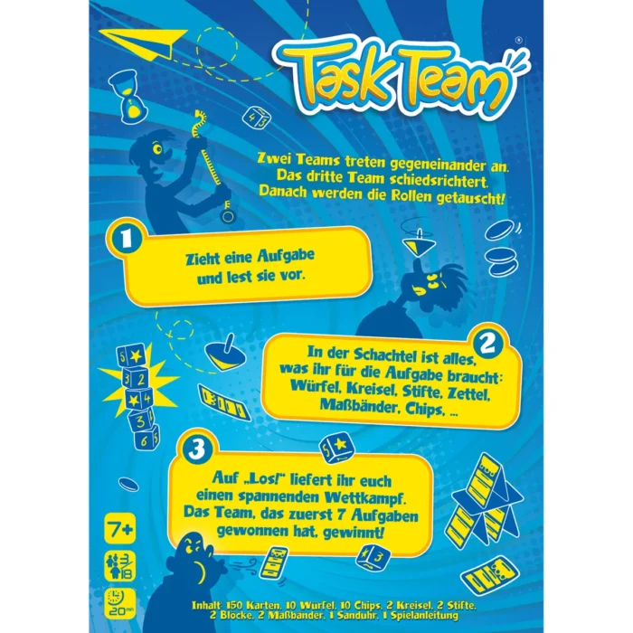 Task Team von Board Game Circus ist das perfekte Partyspiel für alle, die spontanen Wettkampf und jede Menge Lacher lieben. Drei Teams treten in 150 abwechslungsreichen Minispielen gegeneinander an, während das dritte Team als Schiedsrichter fungiert und die Spannung mit dem legendären Countdown „Task! Team! Los!“ einleitet. Von Geschicklichkeitstests mit Kreiseln und Würfeln bis hin zu kniffligen Teamaufgaben mit Maßbändern und Sanduhren – jede Runde bringt neue Herausforderungen. Das Spiel eignet sich hervorragend für Gruppen von 3 bis 18 Personen ab 7 Jahren und dauert nur etwa 20 Minuten. Wer als erstes Team sieben Aufgabenkarten gewinnt, wird zum Champion gekrönt!