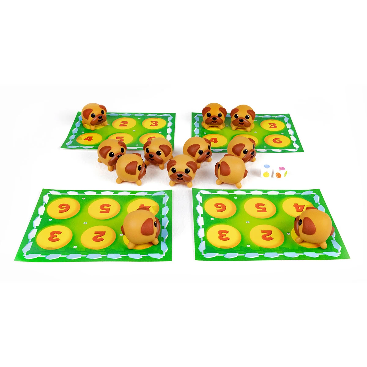 Das Geheimnis liegt im Drücken: Wenn ihr einen der 12 weichen Hundchen vorsichtig zusammendrückt, streckt er seine Zunge heraus – und zeigt, welche Farbe er hat. Stimmt sie mit einem Würfelergebnis überein, darf das Hündchen in euren eigenen Garten einziehen. Wer sich alle Zungenfarben gut gemerkt hat, ist klar im Vorteil. Das erste Kind mit 6 Hunden im Garten gewinnt die Partie von Zungen raus!